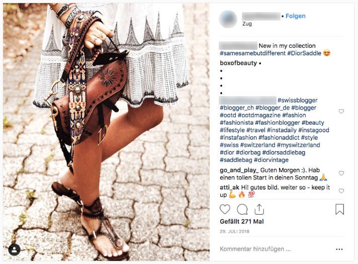 Die Vermutung, dass dieses Phänomen auch in Deutschland und Europa existiert, ist nicht allzu gewagt. OMR hat auch hierzu versucht, hiesige Beispiele zu finden. Im Sommer hat die High-Fashion-Marke Dior eine offenbar offenbar orchestrierte Influencer-Kampagne für eine neu designte Variante der „Dior Saddle Bag“ durchgeführt. Die Kampagne wurde zwar kritisiert, weil nicht alle Posts als Werbung gekennzeichnet waren. Sie erhielt wegen der namenhaften und reichweitenstarken beteiligten Influencerinnen aber auch viel auf Aufmerksamkeit. Von einem Tag auf dem anderen gab es für Fashion-affine Instagram-Nutzer am Hashtag #diorsaddle kaum ein Vorbeikommen.
