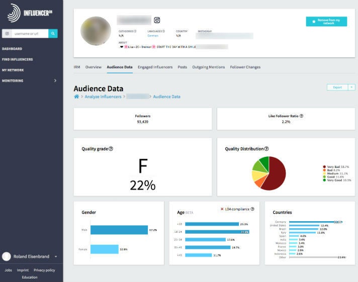 Wie das Instagram-Analytics-Tool Influencerdb die Qualität der Reichweite von Lisa S. bewertet (anonymisierter Screenshot)
