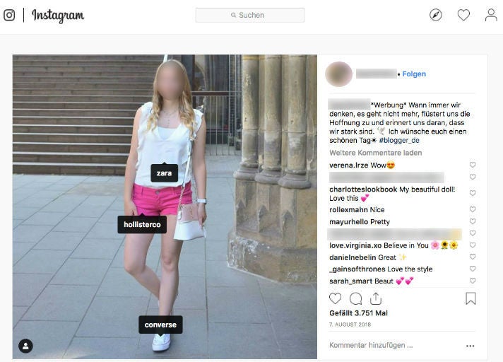 Ein weiterer auffälliger Account ist der einer Modebloggerin aus Baden Württemberg, die viele ihrer Instagram-Posts ebenfalls als Werbung deklariert. Kristina K. verzeichnet rund 41.000 Abonnenten; Influencerdb bewertet die Reichweite mit der Note „D-„, also „ausreichend“ mit der Tendenz zu „mangelhaft“. In einem ihrer als Werbung gekennzeichneten Fotos bewirbt sie nicht nur die Fast-Fashion-Marke Zara, sondern auch die beiden Designer-Labels Sandro Paris sowie Tory Burch. Auch hier ist in der Frage, ob die Posts wirklich bezahlt sind, zumindest eine gesunde Portion Skepsis angebracht.