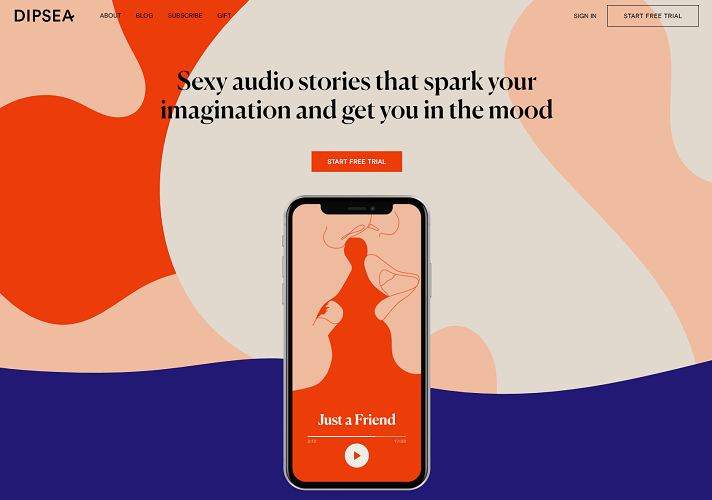Worum es bei Dipsea geht, sehen wohl alle auf den ersten Blick. Hier paaren sich gutes, Aufmerksamkeit erregendes Design, eine eindrückliche Headline und ein klarer Call-to-Action in Form des Buttons. Außerdem können Besucher:innen interaktiv werden, indem sie auf den Play-Button im Smartphone klicken. Dort ist ein Ausschnitt aus einer Audio-Story like Dipsea zu hören.