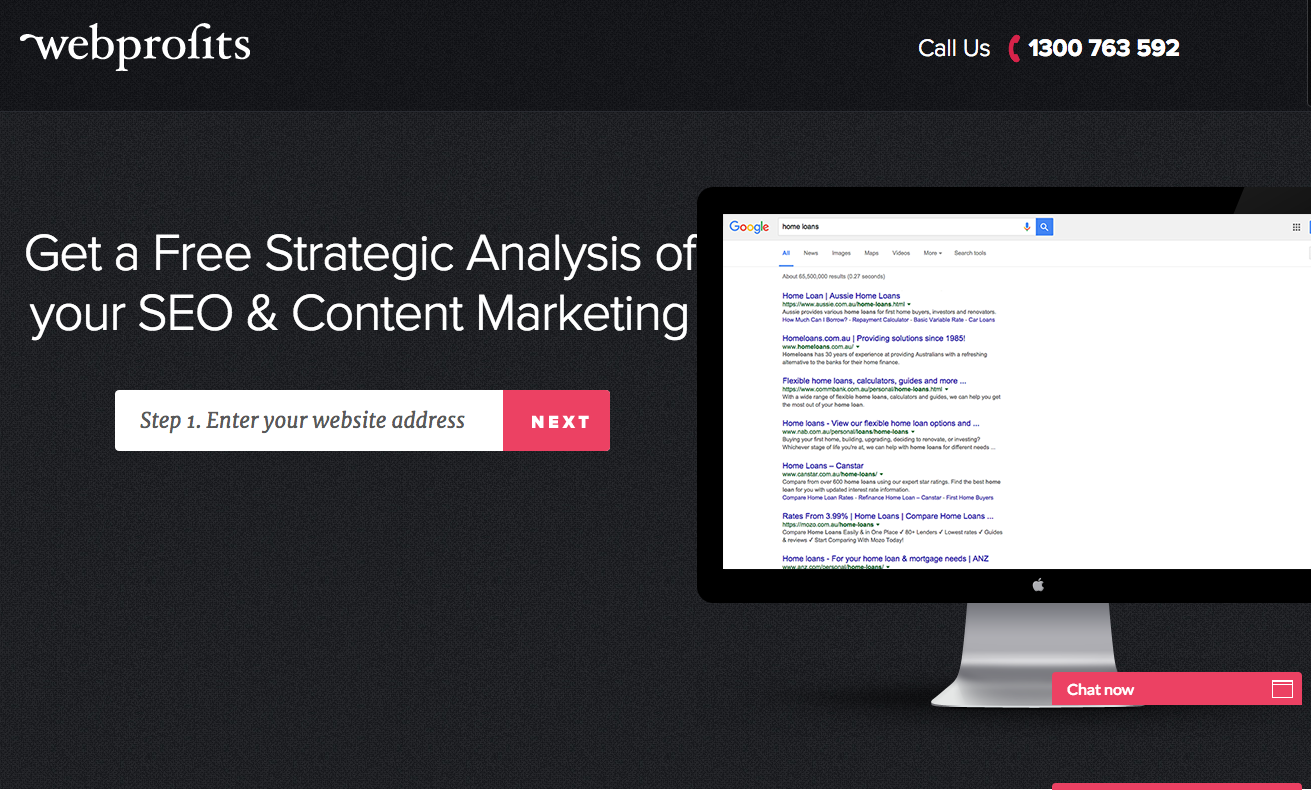 Ein gutes Beispiel für eine Landingpage gibt auch Webprofits ab. Das Formular ist in mehrere Steps aufgeteilt, was es angenehmer für Besucher:innen macht. Zudem zeigen Headline und Screenshot, was man bekommt. Ein Chat und die Telefonnummer beweisen, dass Webprofits bereits Interesse an den Besucher:innen zeigt, obwohl es sich zunächst nicht um zahlende Kund:innen handelt. Damit steigt die Wertschätzung.
