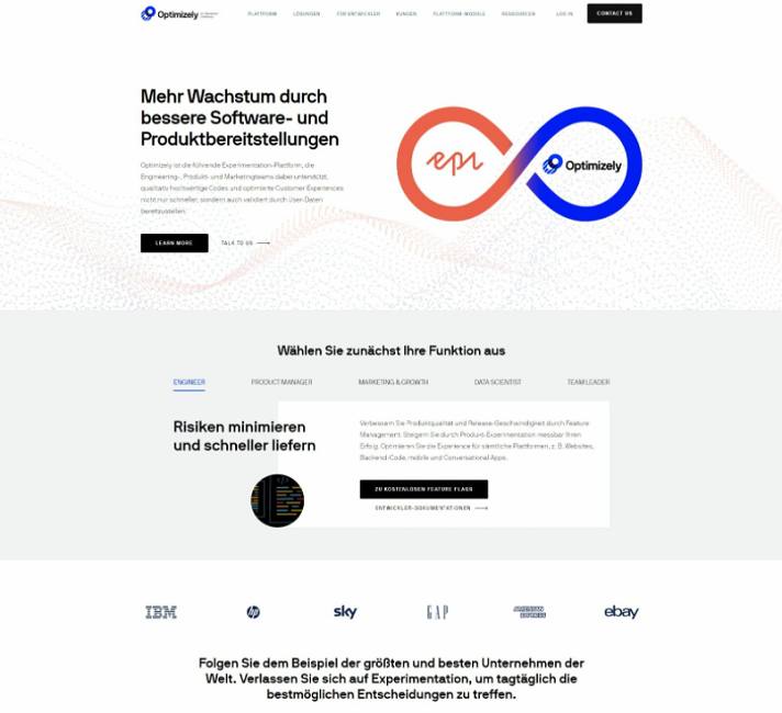 Der Softwareentwickler Optimizely trumpft mit einem schlichten, aber seriösen Design sowie wohlüberlegte Parts auf. Demnach steigen User:innen mit einem Textblock und einer Headline ein, worunter sie die Möglichkeit haben, über ein CTA mehr Infos zu erhalten oder Kontakt zum Unternehmen aufzunehmen. Doch darauf zielt die Landingpage nicht ab. Mittelpunkt ist die Funktionswahl in der Mitte des holistischen Landingpage Beispiels. Dort lässt Optimizely den User:innen zunächst auswählen, welche Position sie in ihrem jeweiligen Unternehmen bekleiden. Hinter jedem einzelnen Reiter verbergen sich anschließend unterschiedliche CTA. Große Namen wie IBM und American Express erwecken zusätzlich Trust.