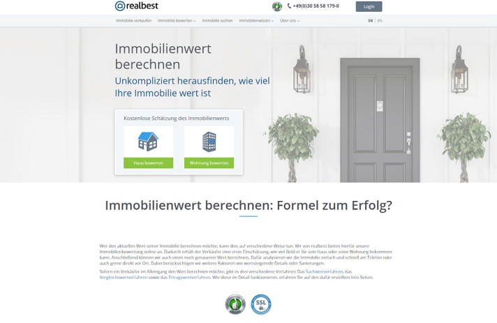 Ein Haus oder eine Wohnung zu verkaufen kann eine recht langwierige und komplexe Angelegenheit sein. Um den Einstieg zu vereinfachen, hat es Realbest richtig gemacht: eine unkomplizierte Landingpage, damit Besucher:innen unkompliziert den Wert ihrer Immobilie berechnen können. Seriosität zeigt sich in den beiden SSL-Schildchen und einer Telefonnummer.