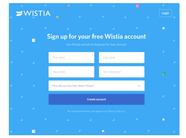 Bei diesem B2B-Landingpage-Beispiel ist die Message klar: kostenlosen Account anlegen, um Wistia zu nutzen. Die Plattform stellt ein Pendant zu YouTube dar; richtet sich aber an Marketer im B2B-Bereich. Hierbei handelt es sich um eine gute Landingpage, weil sie ebenfalls schlicht gehalten ist und das Formular auf das Notwendigste beschränkt. Wer die Daten nicht unbedingt braucht, kann sogar das unterste Formular-Feld weglassen. Die Aufgabe für Besucher:innen ist glasklar und kennt keine Hürden. Das Blau strahlt außerdem Seriosität aus.