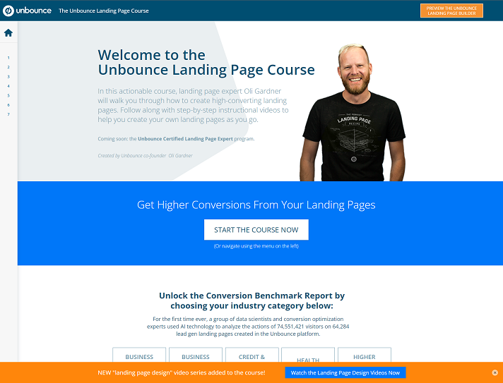 Fallen wir direkt mit der Tür ins Haus: Das Design ist nicht besonders ansprechend. Dafür machen Unbounce (Teste Unbounce jetzt 14 Tage kostenlos) ungefähr 3481 andere Dinge richtig. Vielleicht ist das auch der Grund, warum das Unternehmen Landingpage-Kurse anbietet. Ihr bekommt ein freundliches Gesicht des Co-Founders von Unbounce zu sehen und mit dem Satz „Get Higher Conversions From Your Landing Pages“ wird dem:der Besucher:in klargemacht, was hinter dem Button darunter zu finden ist.