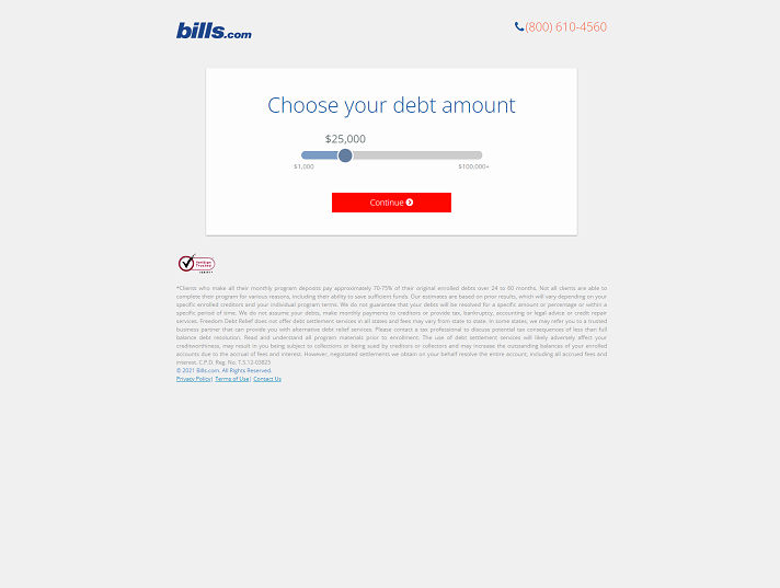 Zunächst wird der Schuldenbetrag abgefragt. Daraufhin folgen zwei weitere Fragen. Währenddessen steigt die Grundnervosität der Besucher:innen, ob am Ende der drei Fragen für sie eine Lösung Ihrer Probleme wartet. Die Erleichterung springt ihnen ins Gesicht, wenn das Formular in Schritt vier auftaucht. Die CVR wird bei Bills.com hoch sein.