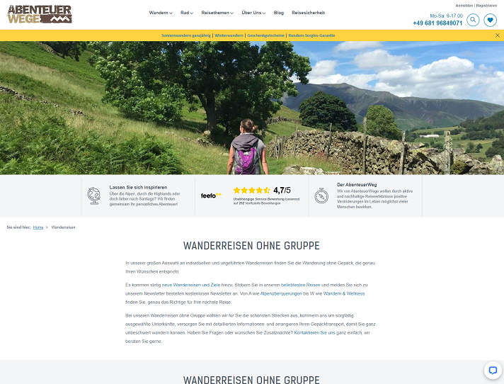 Bereits der Above-the-Fold-Bereich ist optimal bestückt. Ein Bild triggert die Vorstellung in schöner Landschaft wandern zu gehen, darunter zeigt eine Bewertung, warum AbenteuerWege ein Top-Ansprechpartner für solche Wanderungen ist, und darunter erläutert ein kurzer Text das Main-Keyword der Landingpage. Ein CTA-Button oder ein Formular sind ausnahmsweise nicht im obersten Bereich zu sehen. Aus gutem Grund.