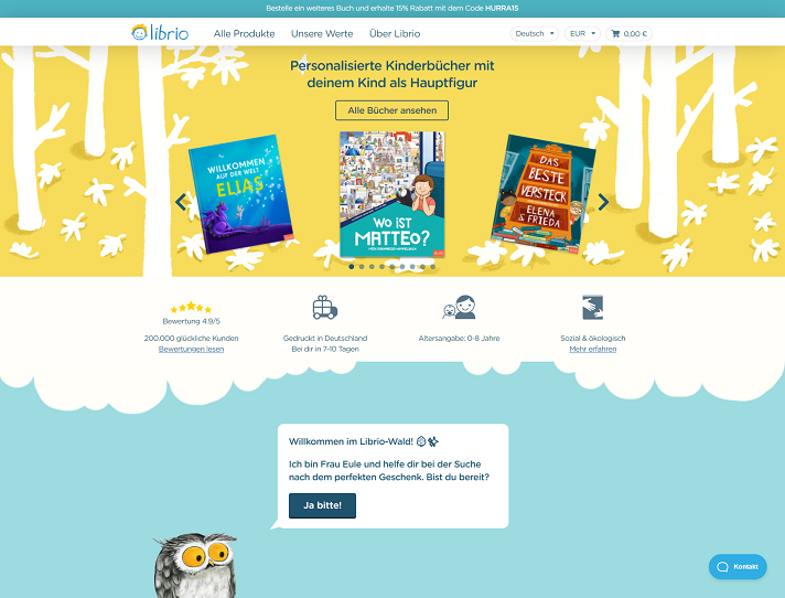 Librios Dienstleistung besteht darin, persönliche Kinderbücher zu kreieren. Der Verkauf sollte brummen, glaubt man den Zahlen, die auf der Landingpage zu sehen sind. 200.000 glückliche Kund:innen sind zu lesen sowie eine herausragende Bewertung. Außerdem stellt Librio klar, wie lange die Lieferzeit beträgt, für welche Altersklasse die Bücher gedacht sind und hinter welcher Purpose das Unternehmen steht. In Kombination mit abgebildeten Büchern nimmt diese Landingpage vielen Besucher:innen schnell eine Entscheidung ab.