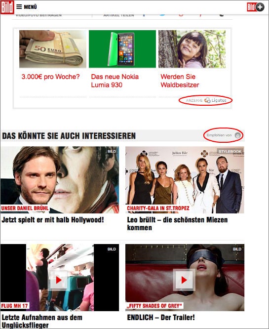 Anzeigen von Ligatus und Content-Empfehlungen von Outbrain auf Bild.de (Screenshot)