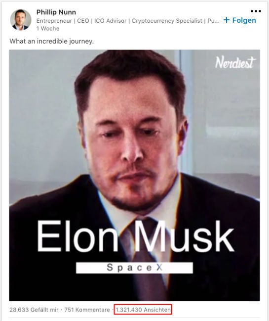 Der Brite erzielt mit diesem Vorgehen teilweise massive Reichweiten. Nicht selten verzeichnen seine Videos fünf- bis sechsstellige Abrufzahlen (laut Marketingland zählt Linkedin einen View nach drei Sekunden). Der von Nerdiest geklaute Clip über Elon Musk ist sogar schon mehr als eine Million Mal abgerufen worden. Auf diese Weise generiert er günstig Aufmerksamkeit für zwei Unternehmen im Finanz- und Investment-Bereich, die er laut seinem Linkedin-Profil führt.