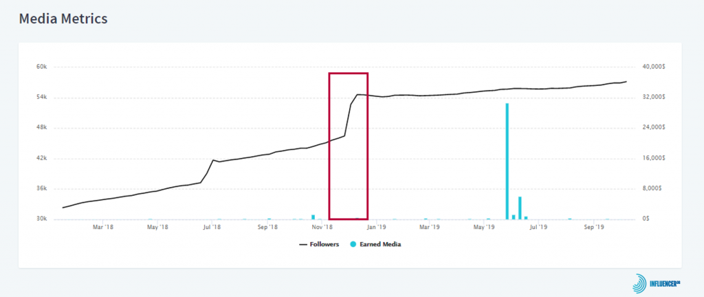 Doch wie sieht die Entwicklung aus, wenn einige Zeit ins Land gegangen ist? Bei BellaBeeBlog gab es bereits im Juni einen Aufschwung von knapp 16.000 auf über 60.000 Follower in nur zwei Tagen. An genau diesen Tagen gab es ein Loop Giveaway von Curated Businesses und Kris Jenner, ähnlich wie das, an dem BellaBeeBlog kürzlich teilgenommen hat. Von Ende Juni bis Anfang Oktober ist die Zahl der Follower bei BellaBeeBlog nun von 60.000 wieder auf unter 40.000 gefallen. Das zeigt, dass viele Follower wieder abspringen, wenn das Gewinnspiel vorüber ist. Trotzdem hat BellaBeeBlog als Account heute weit mehr Follower als vor der Teilnahme an Loop Giveaways. Auch die Makeup-Influencerin Denisa Simam gewann nach einem Loop Giveaway im November 2018 tausende Follower. Danach sank die Zahl der Abonnenten wieder, aber nicht so stark, dass alle zuvor hinzugewonnenen Follower wieder verloren gegangen wären.