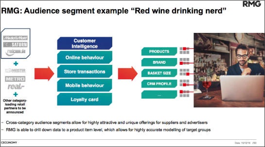 Offensichtlich sollen also Werbetreibende die Kunden- und Transaktionsdaten aus dem Netzwerk der RMG nützen können, um die Auslieferung ihrer Online-Werbung zu optimieren. Dafür können sie konkrete Zielgruppen bei RMG einkaufen. Der einzelne Kunde ist dabei nicht persönlich identifizierbar, sondern wurde zuvor entsprechend seines Einkaufsverhaltens so genannten „Audience Segments“ (im Grunde ein Cookie Pool) zugeordnet – beispielsweise „Rotweintrinker“. „RMG kann die Daten bis auf die Produktebene aufbohren, was es möglich macht, sehr genaue Zielgruppen zu modellieren“, heißt es in der Präsentation.