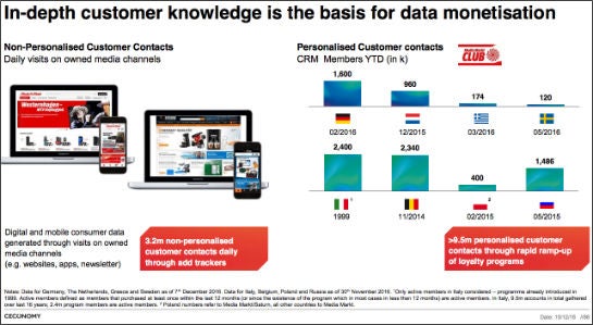 Zur genauen Zahl der Kundenprofile, über die die Retail Media Group verfügt, macht das Unternehmen keine Angaben. Laut offizieller Präsentation erzielt Ceconomy pro Tag 5,8 Millionen Kundenkontakte pro Tag – darunter sind 1,9 Millionen Unique User online. Im Januar war Mediamarkt.de letztmalig im Digital Facts Ranking der Arbeitsgemeinschaft Online-Forschung aufgeführt; mit 12,2 Millionen Unique Usern. Der Aufbau des Kundenbindungsprogramms „Mediamarkt Club“ (europaweit nach Unternehmensangaben aktuell 9,5 Millionen Mitglieder) soll möglicherweise auch dazu beitragen, Ladenkäufer in der digitalen Welt zu markieren und wieder identifizieren zu können.