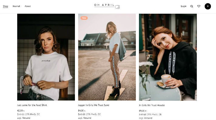 „Ich wollte nicht länger ’nur‘ tragen sondern auch anfangen, mitzugestalten. Aber es sollte bloß kein Merchandise werden, sondern Mode, die dazu im Stande ist, mich selbst zu überdauern“, sagt Carmen Kroll. Im Online-Shop von Oh April reicht das Angebot von Statement-Shirts mit Sprüchen wie „In Girls We Trust“ oder „I Came For The Food“, über Blusen bis hin zu schlichten Jumpsuits. „Wir entwerfen alles selbst und erstellen sogar viele unserer Prints selbst. Uns war wichtig, dass wir einen Standort wählen, der in Europa liegt, um regelmäßig selber vor Ort sein zu können und sehr hochwertig produzieren zu lassen. Deshalb kommen alle unsere Produkte aktuell aus Portugal“, sagt Zwingenberg. Die Preise der Klamotten variieren von 42 Euro für ein Shirt bis zu 98 Euro für einen Jumpsuit.