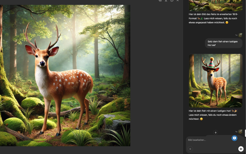 Ebenfalls eine Neuerung: Die Bildgenerierung behält jetzt bei Anpassungen die ursprüngliche Komposition bei – es wird also nicht mehr jedes Mal ein völlig neues Bild von 0 erstellt. In unserem Beispiel wurde Bambi auch direkt noch ein fetziger Hut spendiert.