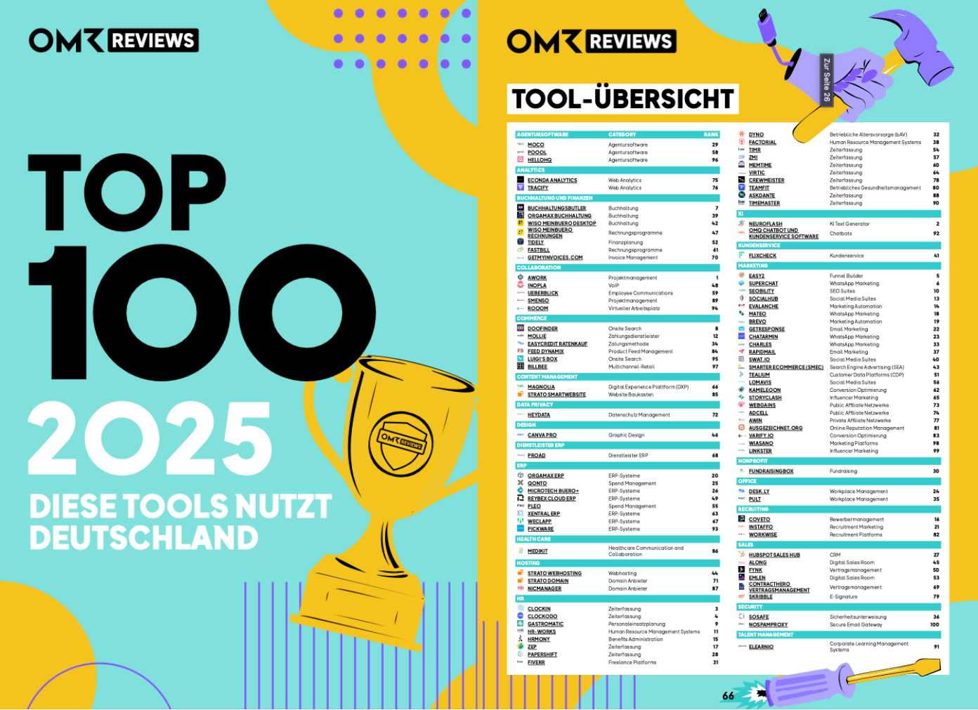 Nun bleibt natürlich die Frage, wie man als Software-Anbieter überhaupt ins Ranking aufgenommen wird. Für die Top 100 beliebtesten Tools im DACH-Raum müssen besonders viele und besonders gute Bewertungen bei OMR Reviews eingegangen sein. Dazu wird dann der sogenannte OMR-Score berechnet. Für den neuen Guide 2025 zählen alle Reviews zwischen Januar 2024 und Dezember 2024.