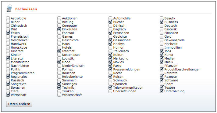 Nachdem ich mich bei Textbroker unter Angabe von Namen, Adresse, Geburtsdatum und Beruf registriert habe, kann ich mein Profil als frisch gebackene SEO-Autorin schärfen, indem ich aus der 86 Themenbereiche umfassenden Maske „Fachwissen“ beliebig viele Kategorien auswähle. Zwischen Fachgebieten wie Wirtschaft und Geschichte, findet man hier auch konkrete Hinweise auf mögliche Aufträge – Inserate, Kostenloses, Pressemeldungen, Gewinnspiele, Produktbeschreibungen, Referate.