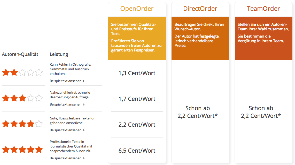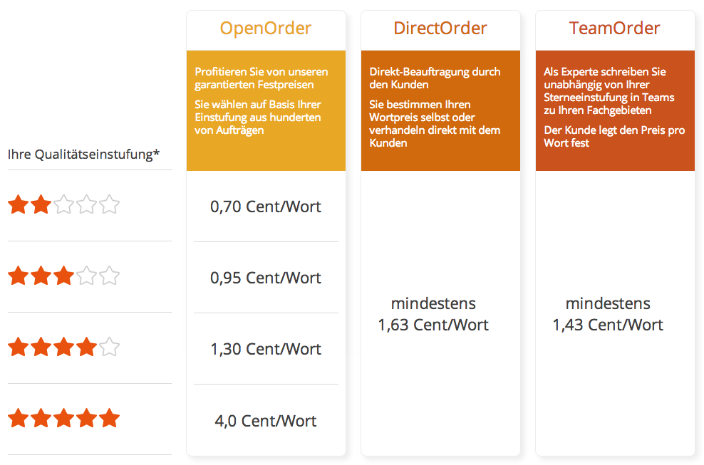 Das Preismodell ist clever gestaltet: Während die Preisunterschiede zwischen Zwei-, Drei- und Vier-Sterne-Texte für Auftraggeber relativ gering sind – 1,3 Cent/Wort, 1,7 Cent/Wort und 2,2 Cent/Wort – sind die qualitativ am besten bewerteten Fünf-Sterne-Texte mit 6,5 Cent pro Wort gleich mal 300 Prozent teurer als die Texte aus der nächst niedrigeren Kategorie. Als Auftraggeber würde ich mich auch am ehesten an die Vier-Sterne-Autoren wenden, die immerhin „gehobene Ansprüche“ erfüllen sollen. Die Vier-Sterne-Einstufung soll die Autoren offensichtlich dazu motivieren, regelmäßig Aufträge zu erfüllen, um sich so irgendwann vielleicht einmal den fünften Stern zu verdienen und damit wesentlich besser vergütet zu werden. Doch wird es dazu vermutlich nie kommen – und wenn doch, dann gibt es so gut wie keine Aufträge. Für die Abwicklung behält Textbroker übrigens 35 Prozent des Preises pro Auftrag als Pauschale ein.