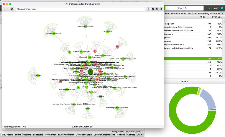 Den Status der aufgezählten Punkte könnt Ihr mit SEO-Tools wie beispielsweise ScreamingFrog analysieren. Der ScreamingFrog SEO Spider ist ein Website-Crawler, der die relevanten technischen Faktoren übersichtlich darstellen kann. Unter anderem lassen sich so Broken Links, Weiterleitungsketten, Canonicals und die Response Time identifizieren. Sicherlich hilfreich ist auch die Visualisierung der gecrawlten Website-Struktur und deren Qualität im “Kräftebasierenden Crawldiagram”.