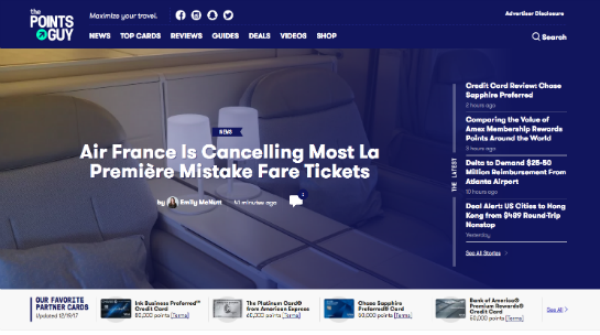 Die Startseite von The Points Guy mit auffälliger Einbindung der Partner-Kreditkarten