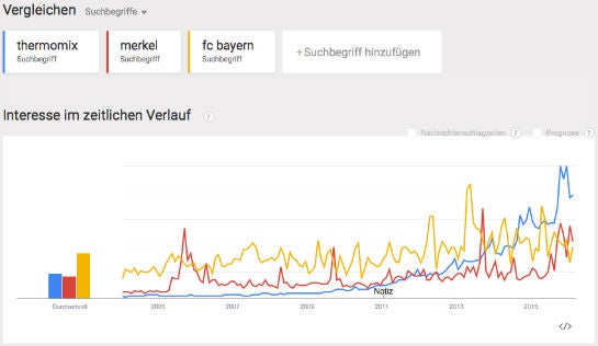 Die Entwicklung der Suchanfragen zu „thermomix“ (blau) bei Google in Deutschland, im Vergleich zu Angela Merkel (rot) und dem FC Bayern (gelb)