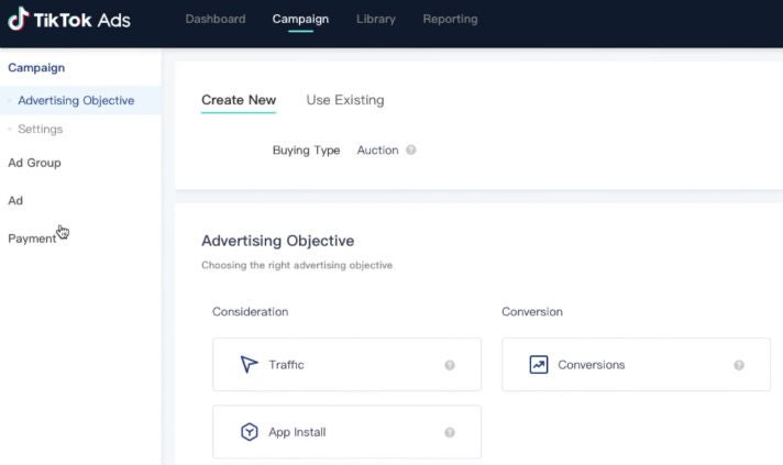 Wer zum ersten Mal über Tiktoks Tool Werbung schalten möchte, muss natürlich zunächst einmal eine neue Kampagne erstellen. Dabei können die Nutzer aus drei Zielvorgaben auswählen: Traffic für eine App oder eine Website generieren, App Installs generieren, oder Conversions (also Transaktionen). Damit die Conversions messbar werden, müssen die Werbetreibenden zuvor (so wie es Standard im Online Marketing ist) einen Tracking-Pixel von Tiktok auf der eigenen Seite oder in der eigenen App einbinden.
