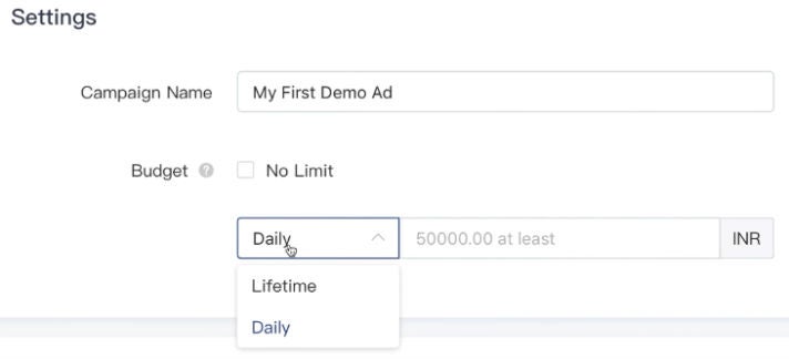 Die Auswahlmöglichkeiten bei der Budgetierung der Kampagne, hier in der Währung indische Rupien (Quelle: Dinesh Jangid)