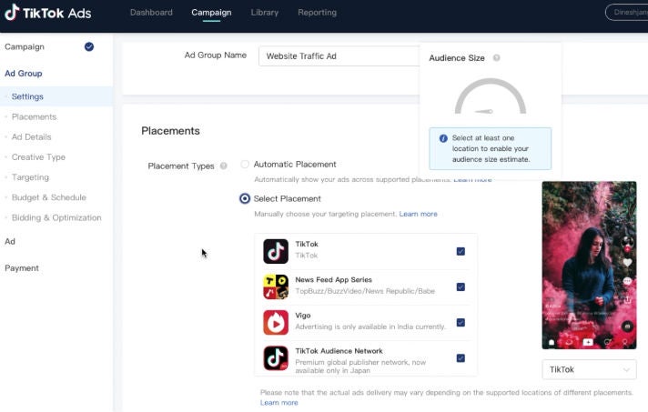 Die Nutzer können eigenständig aus verschiedenen Inventaren auswählen, oder es den Tiktok-Betreibern überlassen, wo diese ihre Werbung platzieren (Quelle: Dinesh Jangid)