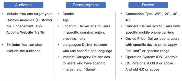 Zu den Optionen gehört zum einen demografisches Targeting nach Land und Region, Geschlecht, Alter (selektierbar in sechs Altersstufen) und Sprache. Hinzu kommt die Möglichkeit des Targetings nach Interessen. Die Nutzer würden, so Tiktok,abhängig davon, wie sie mit der App und dem Content interagieren (dabei würden Views und Clicks berücksichtigt), in Interessensgruppen wie Eltern, „Beauty & Körperpflege, Reise, Haustiere, Games, Reisen, Sport, Essen & Trinken sowie News & Entertainment eingeteilt. Die Qualität dieser Daten wird wohl für den Erfolg von Tiktoks Werbeplattform entscheidend sein. Facebook ist es über die Jahre gelungen, sehr tiefe Nutzerprofile zu erstellen; die Nutzer von Google sind bereits durch ihre Sucheingaben teilweise sehr genau nach ihrem aktuellen Interesse vorqualifiziert.