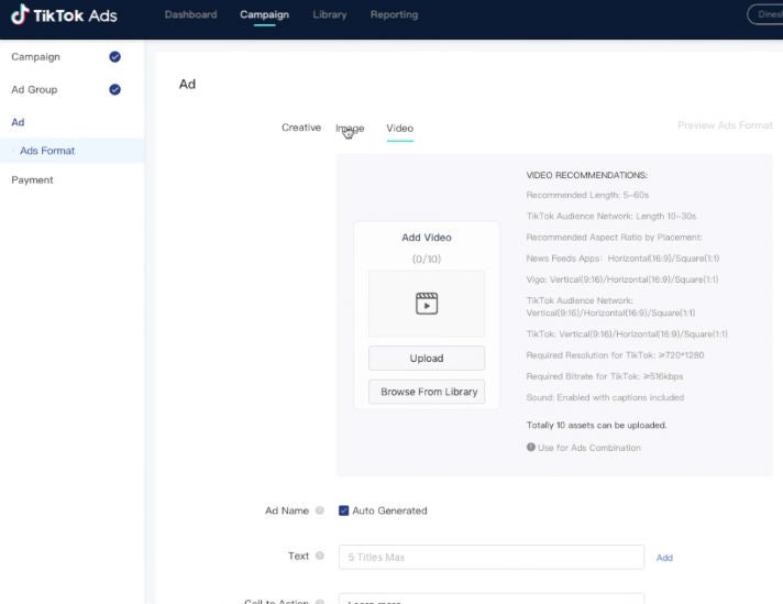 Auf der untersten Ebene der Kampagnenerstellung können die Nutzer die Anzeige erstellen und dabei zwischen Bild- und Video-Ad wählen (Quelle: Tiktok)