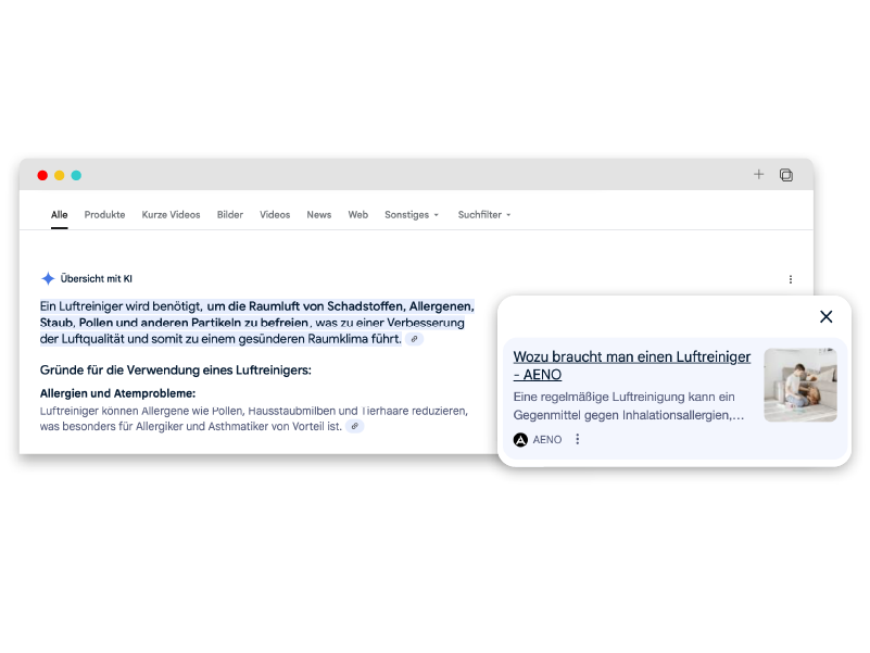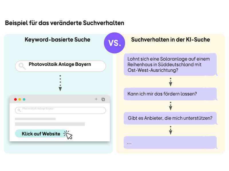 Mit dieser Entwicklung verändert sich auch die Art der Suche. Statt einzelner Keywords geben Nutzer*innen zunehmend komplexe, natürlichsprachliche Prompts in die Suchzeile. Sie erwarten personalisierte Antworten – häufig ohne eine Website noch aufrufen zu müssen. Systeme wie Google AI Overviews oder ChatGPT liefern diese Antworten in der Suchoberfläche.