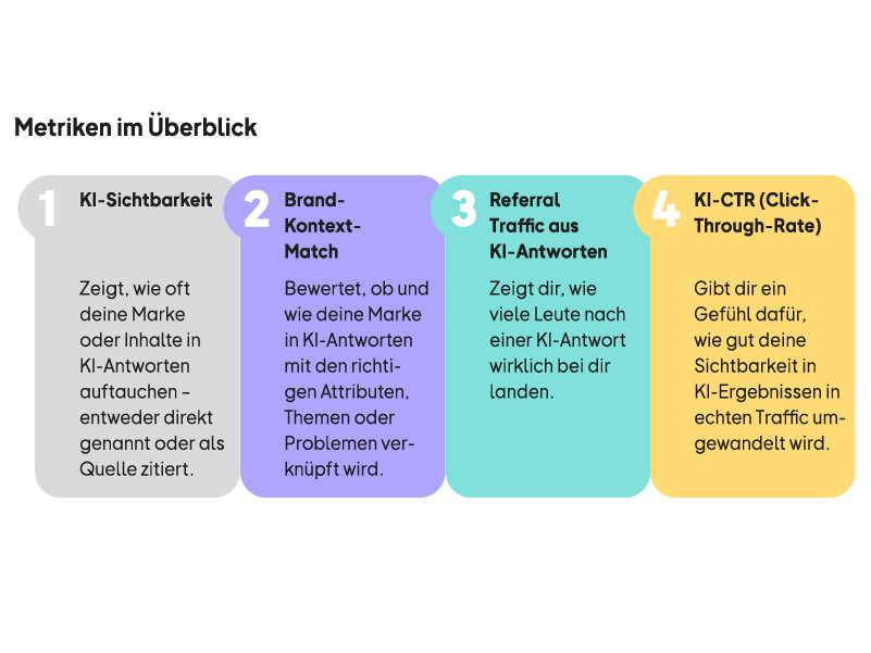 Mit GEO verschiebt sich auch die Messung von Erfolg. Klassische KPIs wie Ranking oder CTR verlieren an Bedeutung, da Traffic oft gar nicht mehr auf die Website gelangt. Wichtiger wird, wie sichtbar die Marke in KI-Antworten ist und ob sie mit den gewünschten Attributen verknüpft wird: