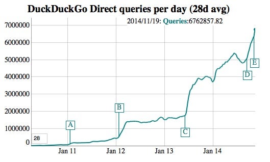 Die Traffic-Entwicklung von DuckDuckGo: Besonders der NSA-Skandal (C) und die Aufnahme in den Safari- und den Firefox-Browser (D&E) haben die Zahl der Suchanfragen steigen lassen
