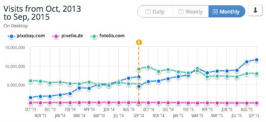 Seit März 2015 liegt pixabay.com laut den Daten von SimilarWeb nach Visits vor fotolia.com und pixelio.de.