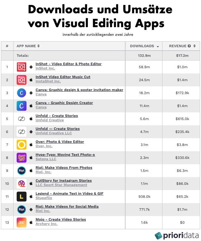 Unfold ist nicht die erste App, die sich auf Video- und Bildbearbeitung für Instagram fokussiert. Wer die Empfehlungen von Influencern durchforstet und den App-Stores mit entsprechenden Keywords sucht, stößt auch auf Namen wie Over, Inshot (iOS / Android), Hype Type (iOS / Android), Cutstory (nur iOS), Ripl und Mojo. Eine Analyse von OMR mittels Priori Data hat ergeben, dass die wichtigsten Apps in den vergangenen zwei Jahren zusammengerechnet mehr als 130 Millionen Mal heruntergeladen worden sind und bislang mehr als 17 Millionen US-Dollar alleine an In-App-Umsätzen verzeichnen.