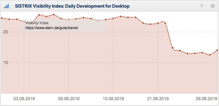 Die Entwicklung des Sichtbarkeitsindexes von Stern.de/Gutscheine im Zeitraum vom 1. bis 29. August 2019 laut Sistrix; deutlich erkennbar der Sichtbarkeitsabfall zwischen dem 22. und 25. August. (Screenshot)