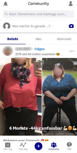 Als zahlende Nutzerin der Weight Watchers (WW) App tauscht sie sich in dieser mit anderen Nutzern über ihre Experimente aus. „Damit hat alles angefangen“, so Altekrüger im Gespräch mit OMR. Die WW-App hat einen eigenen Community-Bereich, der wie eine Nischen-Version von Instagram anmutet. Die Nutzer können Fotos posten, liken und kommentieren sowie sich gegenseitig folgen; Hashtags gibt es ebenfalls. Die WW-User können mit den Posts ihre Fortschritte dokumentieren, sich gegenseitig anfeuern und neue Motivation erhalten. Lediglich die Möglichkeit, Direktnachrichten zu schicken, fehlt.