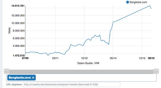 Visitor trends on songtexte.com. From June 2014 to May 2016, the portal was not excluded by the IVW. (Source: Meedia)