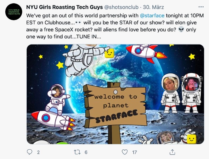 As Clubhouse’s current chat function is limited at best, the NYU Girls set up their own web chat. In addition, they’ve entered into several different partnerships with companies relevant to their core audience, e.g. with vegan pimple patch maker Starface, pizza delivery service Slices and CBD drink maker Recess. Based off of deals other creators of a similar vein have struck in the past, it’s realistic to assume that the NYU Girls receive between 1 and 5K USD for each sponsored events.