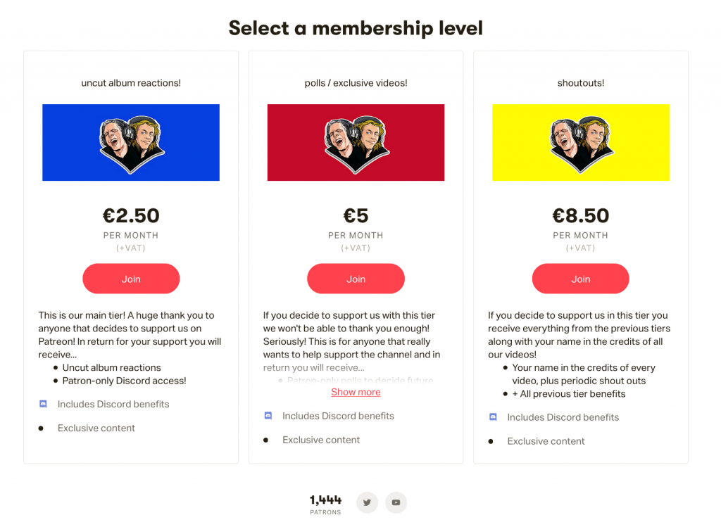 In each of its 15 videos, "turning the tables" links to the recording artist(s), the credited songwriter(s) and publishing rights holder(s). By doing so, they protect themselves from any copyright infringement claims—but are also prevented from earning anything from the embedded ads. That's a primary reason cited by the pair for opening a Patreon account. The proceeds earned from the Patreon account "will go directly back into our channel! (Better equipment, more vinyl giveaways, etc.)." turning the tables offers three different membership levels, including exclusive polls to decide future reaction videos, uncut album reactions and additional content. Two weeks after launch, the channel had a total of 1436 Patrons, which, if you take the cheapest membership level (USD 2.50), they would amount to just over 3K a month in revenue.