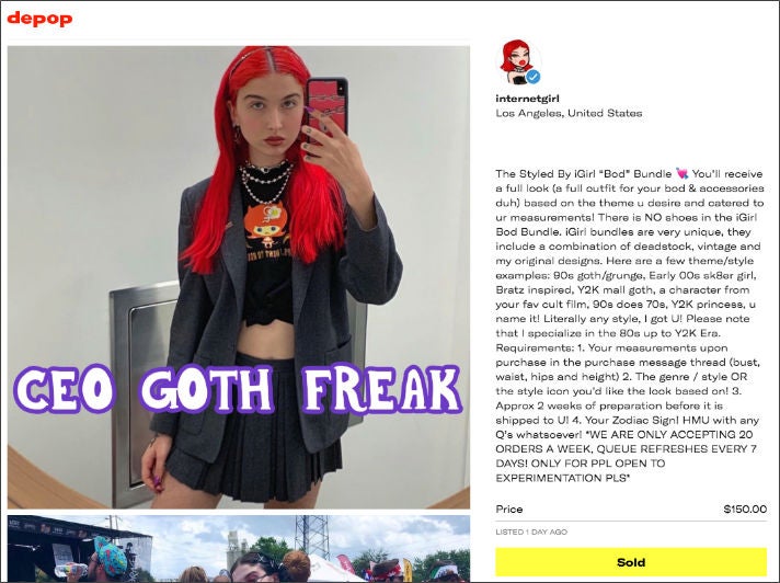 Isabella McFadden’s instinct for such trends has propelled her to one of the most well known “Depop influencers.” Today, she has approximately 578,000 followers on the platform; she has generated some 23,000 sales to this point. “Bundles” are one of her bestsellers, where she sells entire outfits for USD 150. Buyers merely need to send McFadden their desired size and style, which can range from “90’s Grunge meets baddie,” “Glam Pixie Nymph,” “CEO Goth Freak” to”Y2K Streetwear Weirdo.”