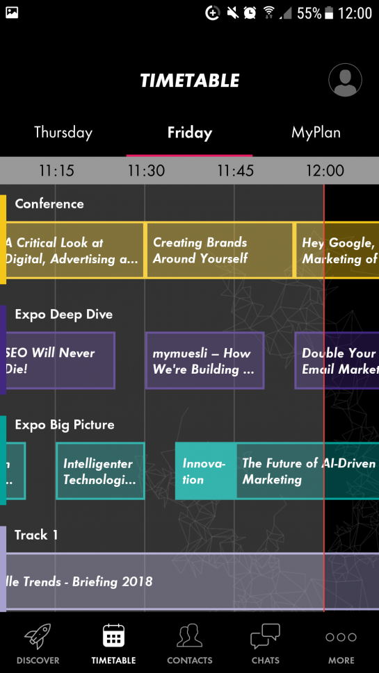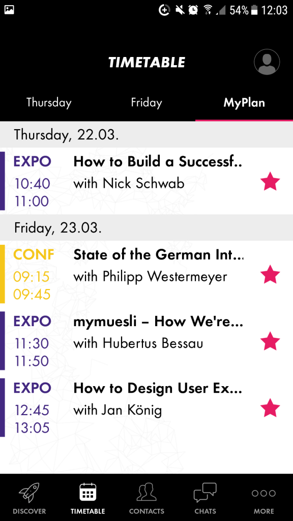 You can also click individual timetable slots. If you want to add one to your personal schedule, just click the star to the upper right. Masterclasses you are confirmed to attend, are automatically added to your plan via your ticket ID. After you’ve added a few favorites, you may see something similar to the following beneath MyPlan: