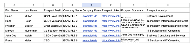 So we have names, position, company name & website and LinkedIn URL plus “About me” description of the leads and the industry. In order to execute multiple requests in one go, we have to link ChatGPT with Google Sheets via CargoAI.