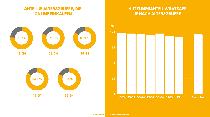 Although it is Generation Z that is driving developments in e-commerce, there are several other age groups that companies can address with conversational marketing. The reason: over 90 % of 45 to 54 year olds use WhatsApp, but are hardly on social networks. The status quo thus currently suggests that different age groups need to be addressed via different marketing channels. C-Commerce can change this and bring many customers and companies together in one place.